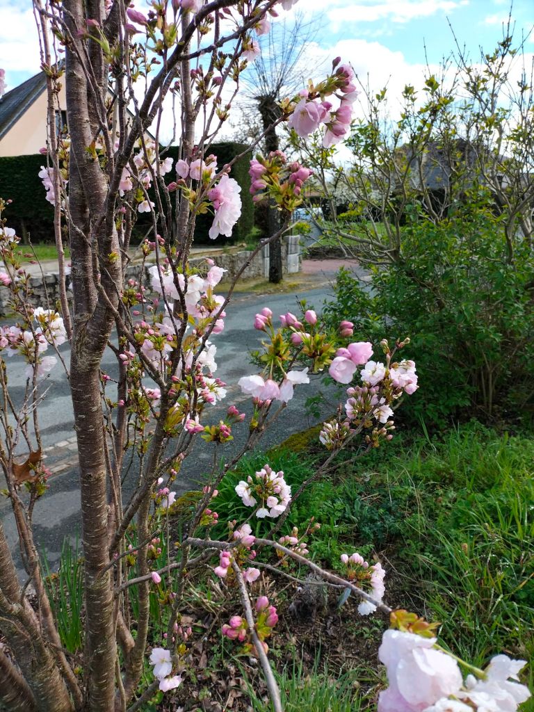 Rien de bien neuf aujourd’hui. Je viens de faire un petit tour au jardin pour prendre quelques photos, mais le vent est bien établi et je n’ai pas pu faire ce que je voulais. Le ciel est voilé… On nous annonce des gelées matinales et des journées bien fraîches, j’espère que le cerisier et le prunier ne vont pas trop souffrir. Poiriers et pommiers ne donnent pas grand-chose. Michel a cru entendre une hirondelle, pauvre imprudente si c’en est bien une.